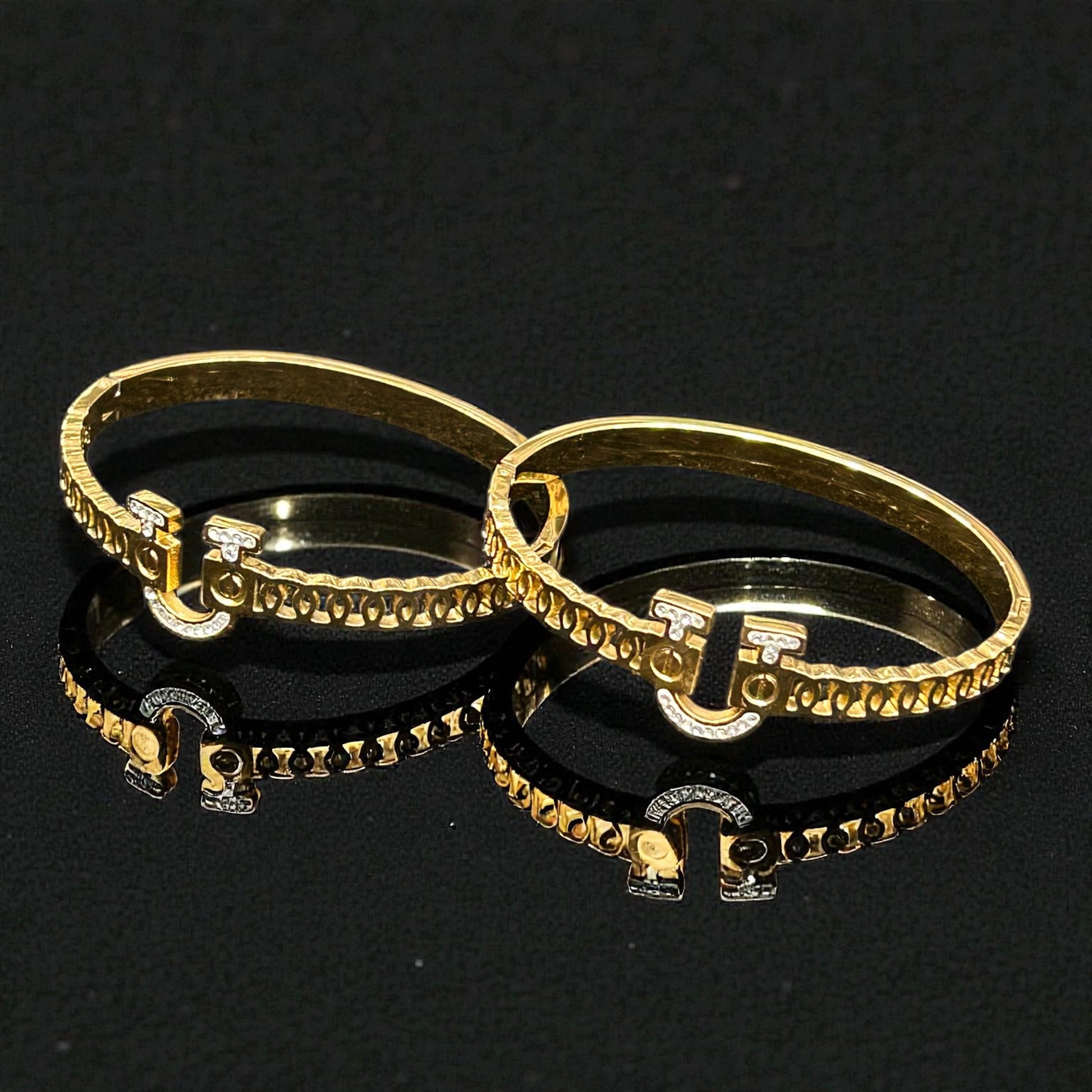 Add a bold yet elegant touch to your jewellery collection with these premium anti-tarnish gold-tone kada bangles. Designed with a stylish lock-inspired centerpiece and subtle crystal accents, these bangles offer a perfect blend of modern luxury and timeless charm. The textured detailing along the band enhances their rich look, making them ideal for both everyday wear and special occasions.