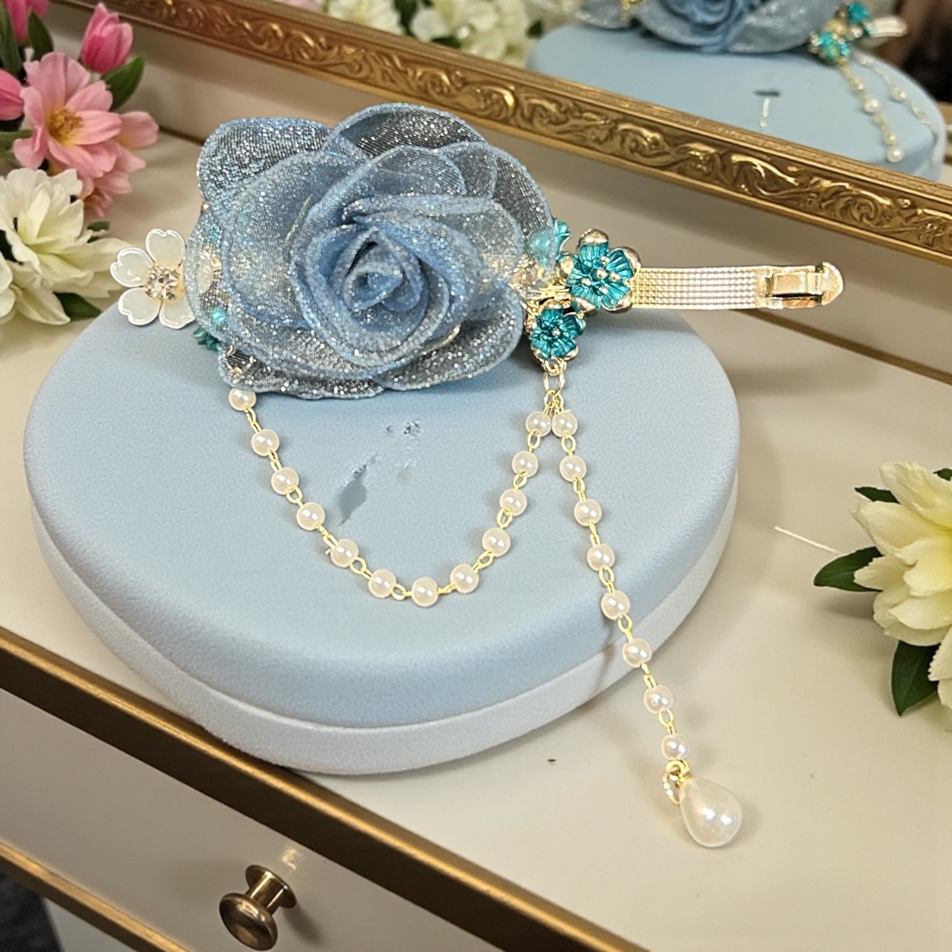 Add a touch of royal elegance to your hairstyle with this beautiful organza rose hair clip, designed with delicate floral detailing and graceful pearl chain tassels. Crafted for special occasions and premium styling, this hair accessory enhances your look with a soft, feminine charm.