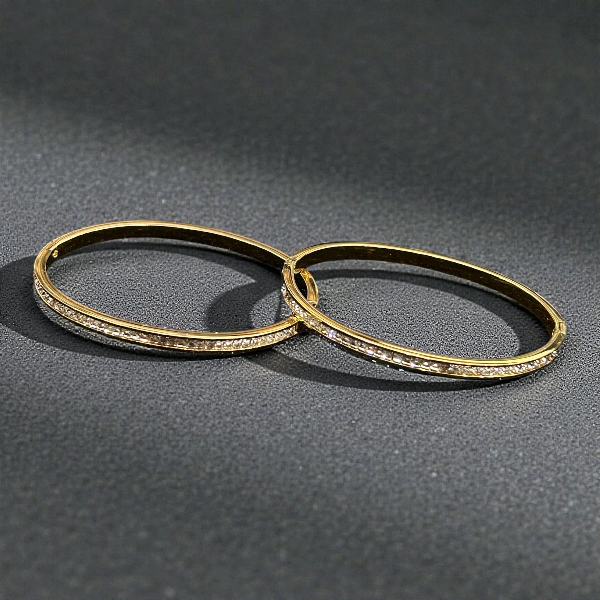 Grace your wrists with timeless elegance through this beautifully crafted gold-tone bangle set. Designed with a sleek, slim profile, each bangle features a delicate line of shimmering crystal stones that add subtle sparkle without overpowering your look. The openable clasp ensures easy wear and a secure fit, making these bangles perfect for everyday comfort.